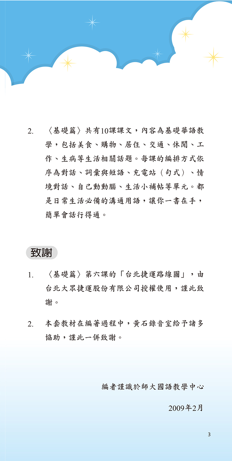 本套教材計2冊,分為〈入門篇〉及〈基礎篇〉,適合零程度華語學習者或短期華語學習者使用。內容包含日常生活必備溝通用語, 並輔以生動活潑圖片穿插表現,透過圖文並列,讓學習者零距離貼近所學語言,是初學華語者最實用的基礎教材。