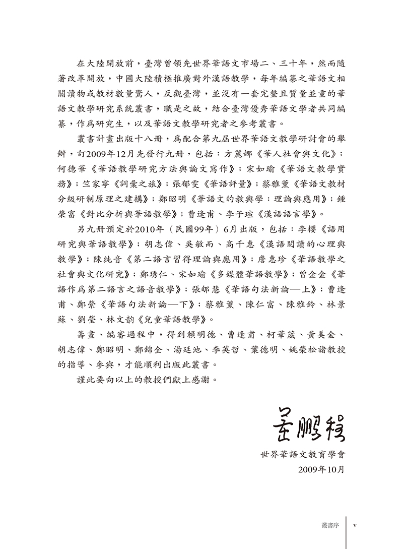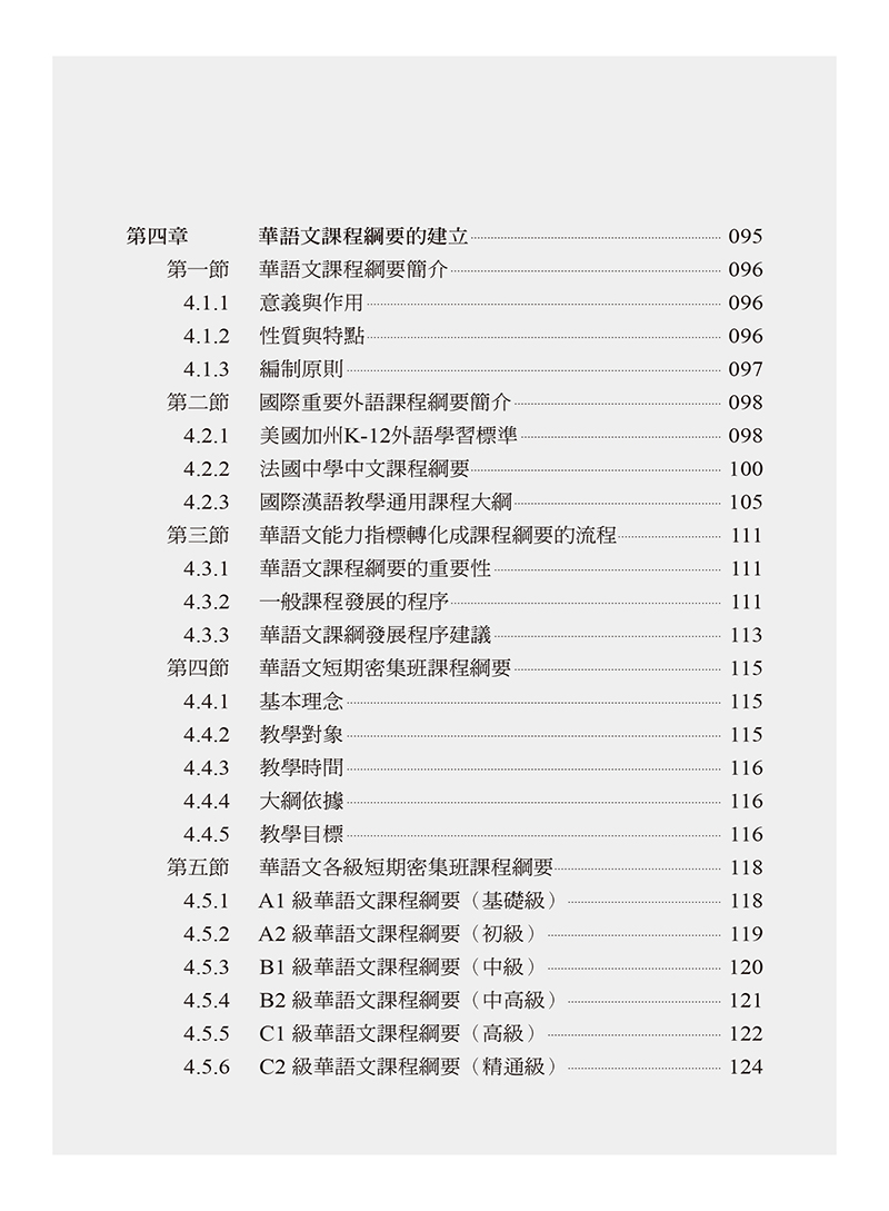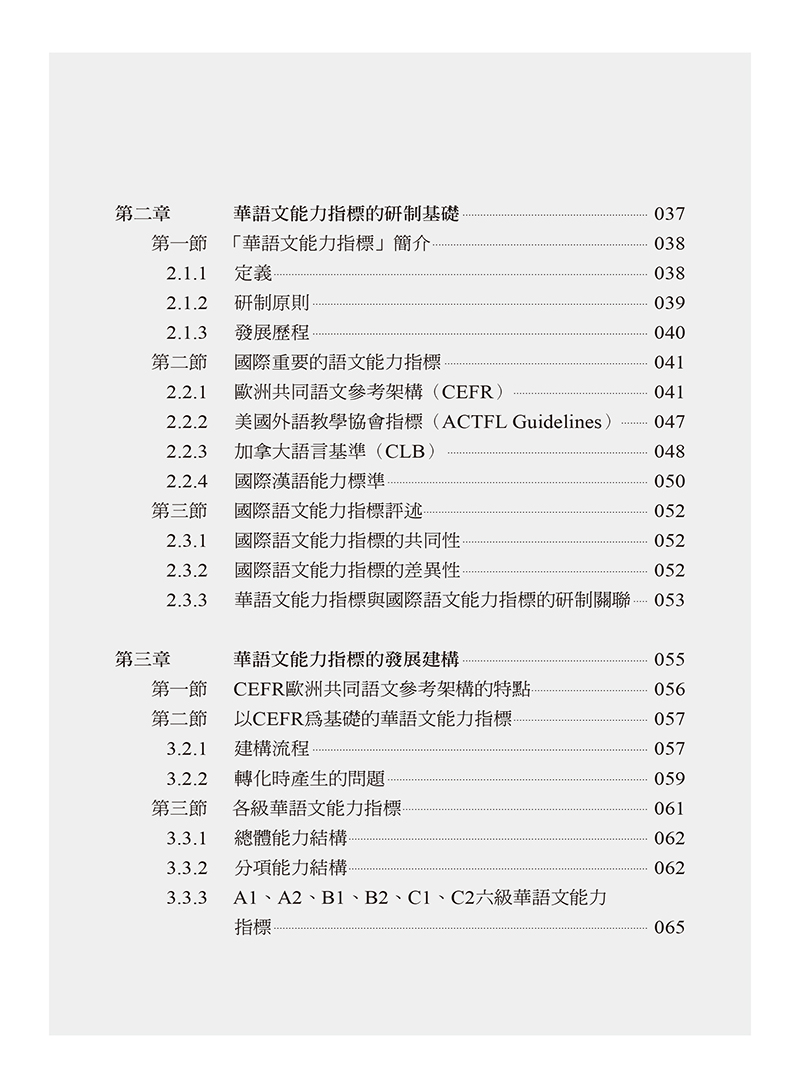 本書結合華語文能力分級原理及華語文教材編寫的實務經驗,內容涵蓋以歐洲共同語言參考架構CEFR為基礎的華語文能力指標、華語文短期密集班課程綱要、華語文教材編寫主題、情境與溝通功能的理論介紹,並提供華語文詞彙、語法分級依據等。全書深入淺出,對於華語文能力分級描述條列清晰,是華語教材編寫不可或缺的重要依據,適合各大學華語文教材教法及華語文教材編寫等專業課程的教科用書,更可提供華語教材編寫人員或華語文測驗評量的研發人員,增強華語專業知能,尤有助益於華語文課文設計、練習題目及測驗評量題型設計的重要參考。