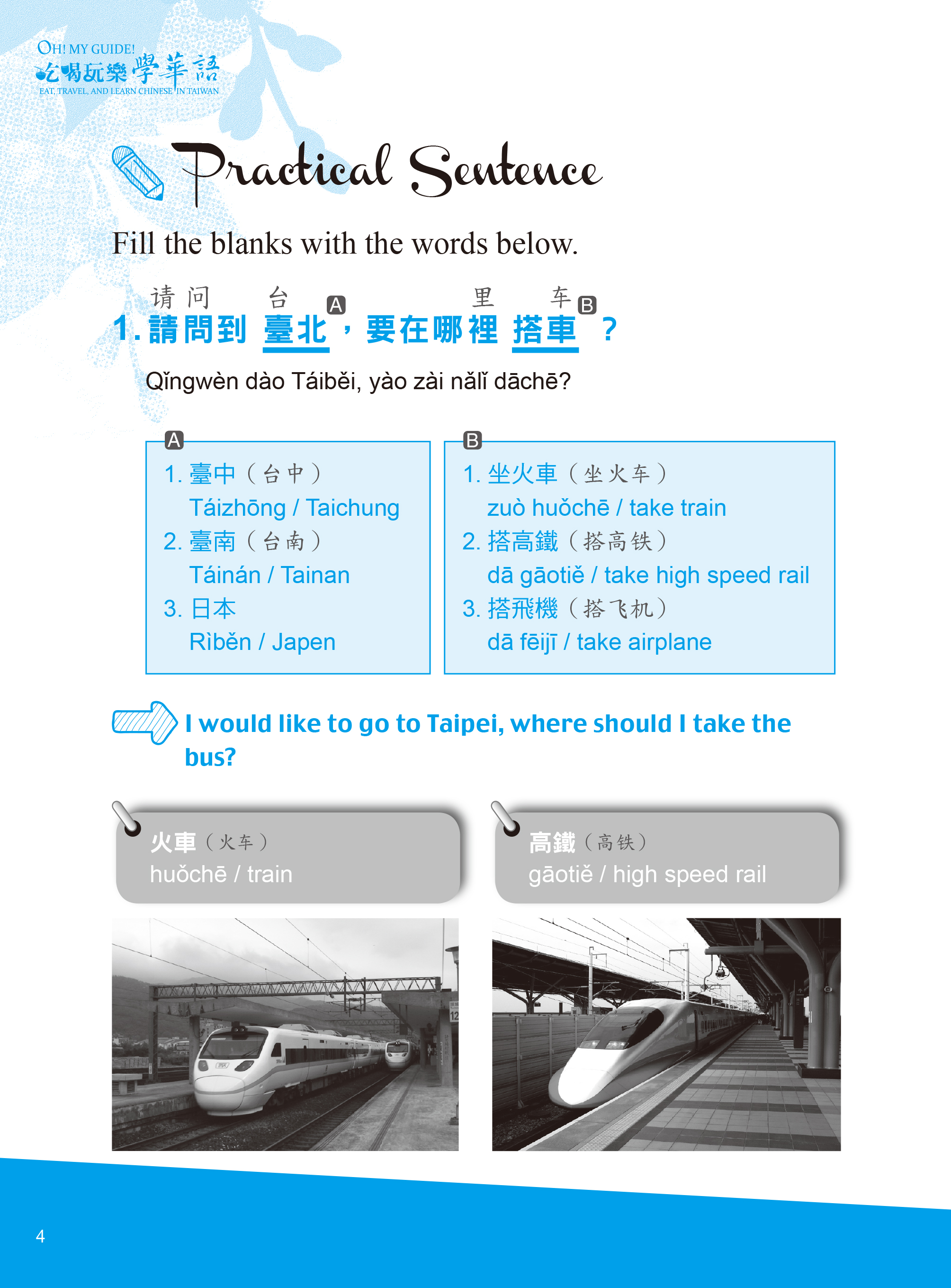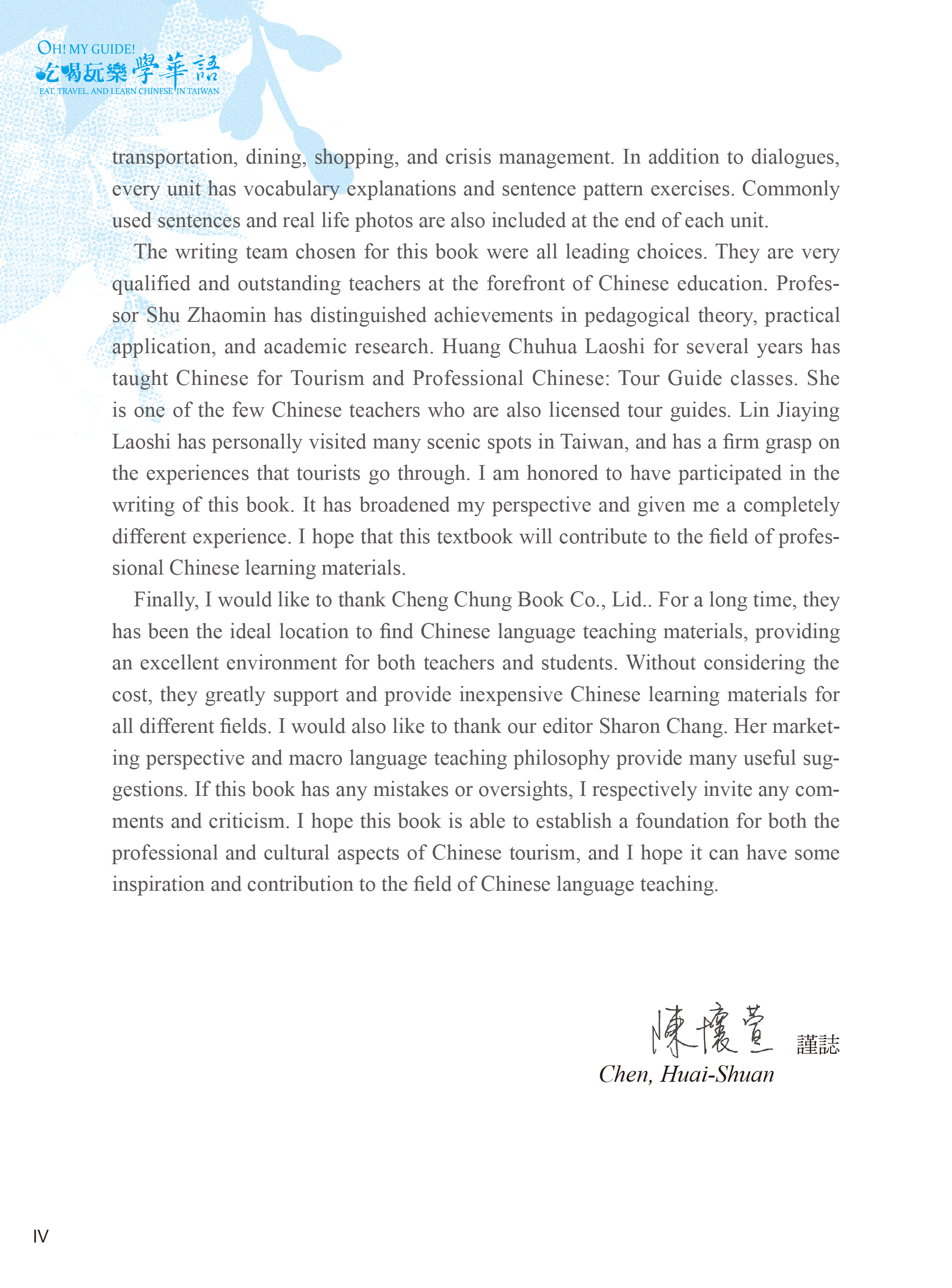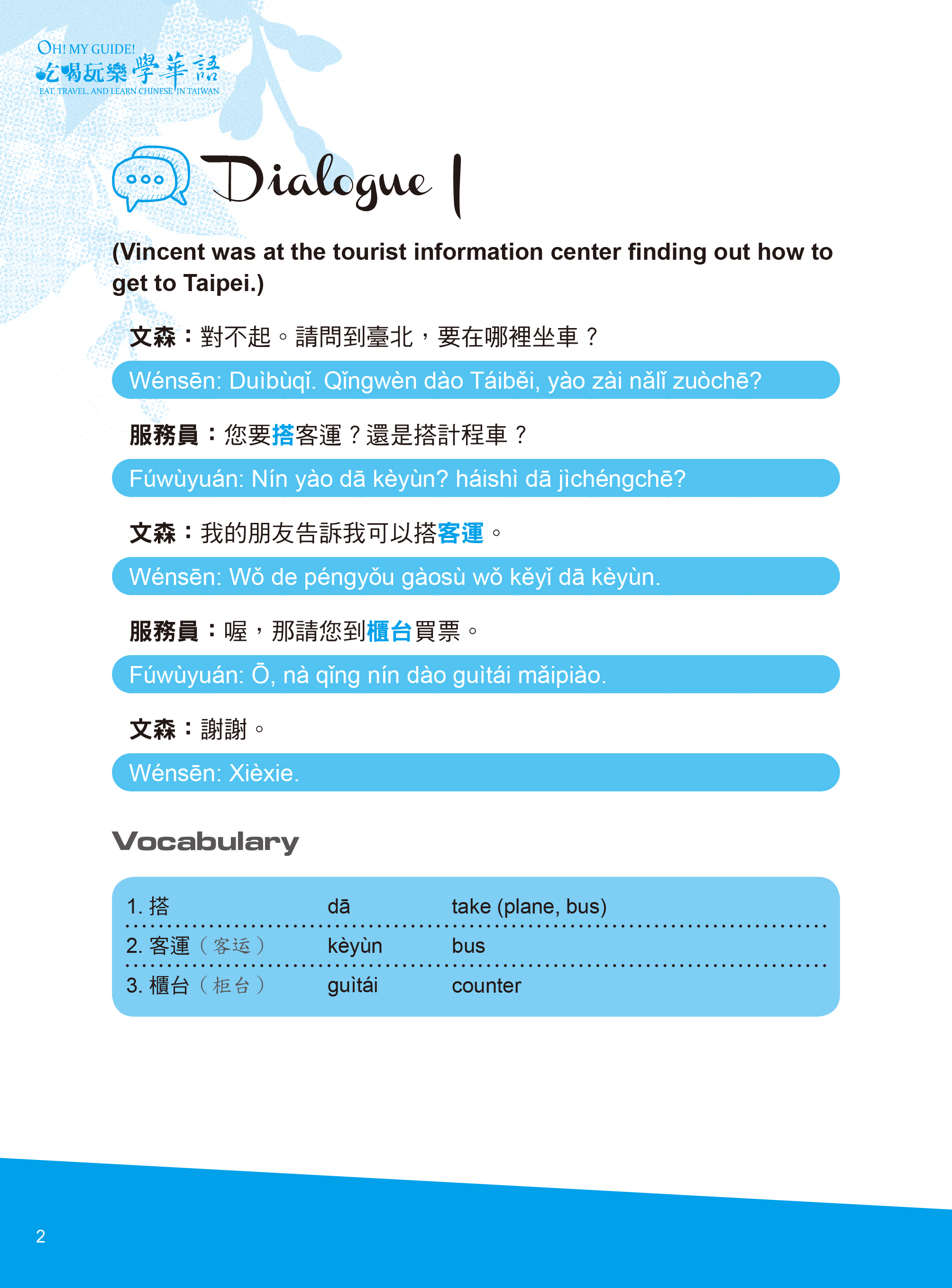《OH! MY GUIDE! 吃喝玩樂學華語》以功能性、主題性及實用性的方式規劃教材架構。 每課皆有3篇情境對話、1頁單元練習、1~2句華語常用說法(類似禮貌/客氣用語)。本書內容規劃以及鎖定的程度,和目前市面上以旅遊為主題的華語教材有所區隔,內容更為實用且生活化,並加入外籍人士在旅途中可能發生的困難並給予解決建議。