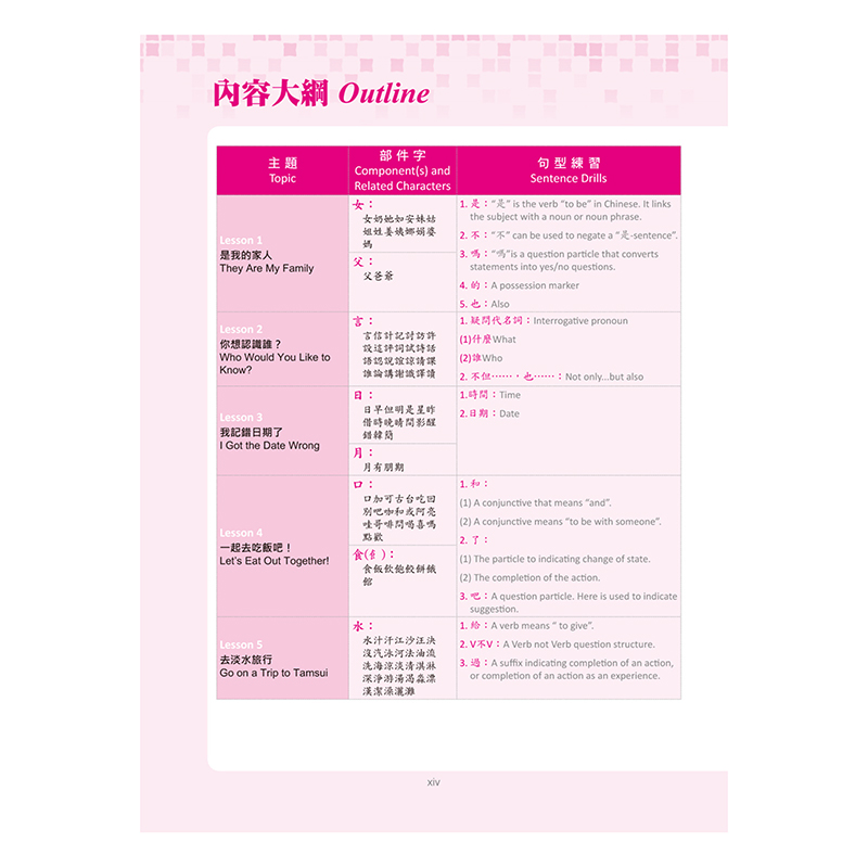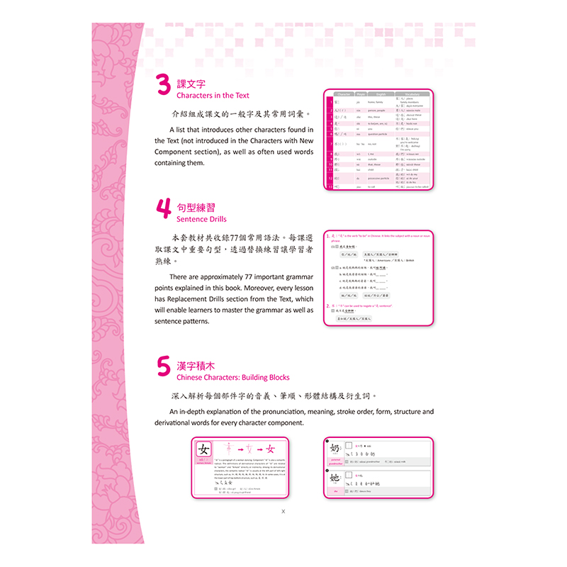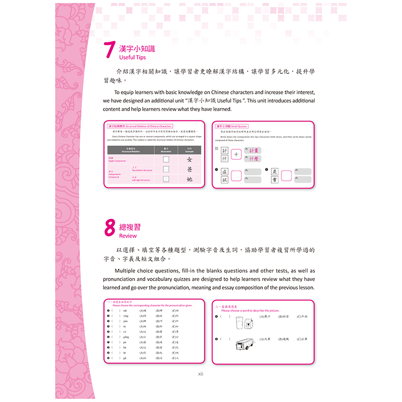 .每課包含「部件字」、「課文」、「課文字」、「句型練習」、「漢字積木」、「有趣的漢字記憶 術」、「漢字小知識」及「總複習」八大單元,深入解析漢字結構,克服學習難點。