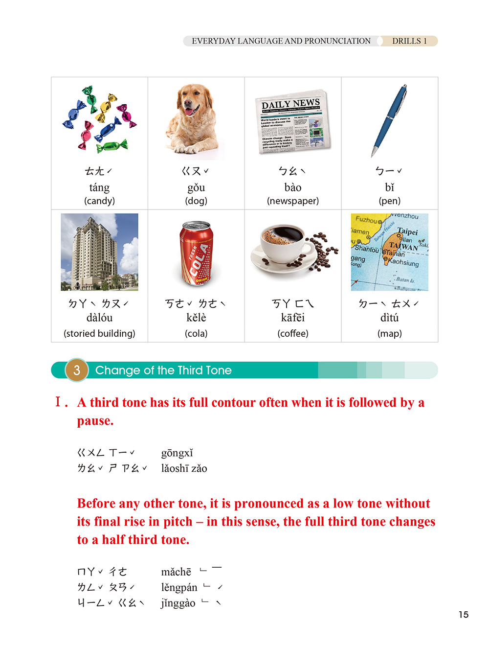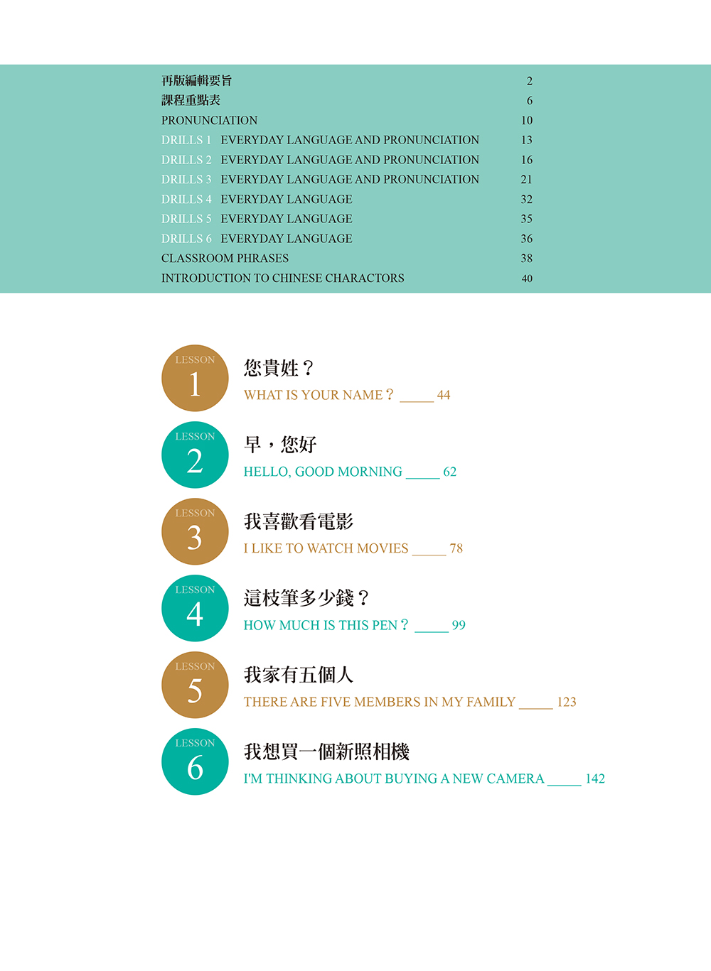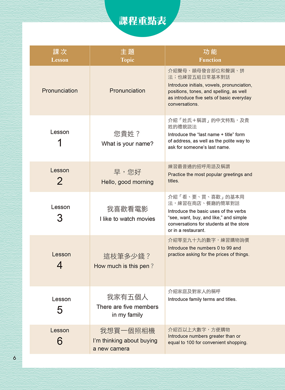 The book is exclusively designed for non-Chinese speakers. It focuses on practicing everyday conversations by training the learners with the basic pronunciations. Through the dialogues in the textbooks, the learners will be guided to learn the frequently used vocabulary and grammar. Through the use of the MP3, the supplementary CD materials, the learners can reach their goals of Chinese proficiency in everyday life. All the vocabulary, characters and example sentences are denoted with Zhuyin, Pinyin and Tongyong Pinyin for a more advanced reading and identifying ability.