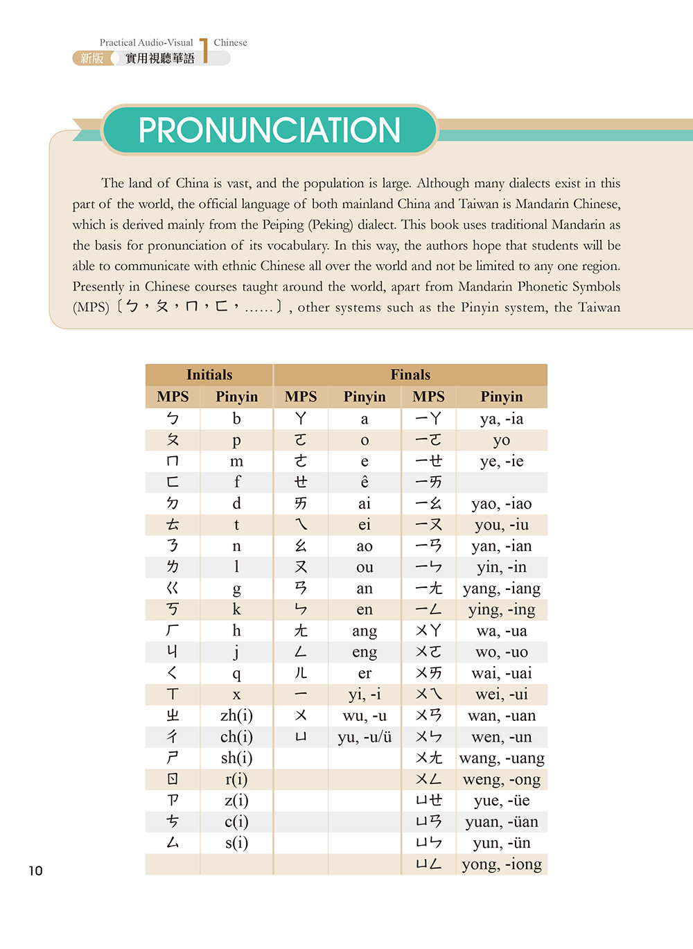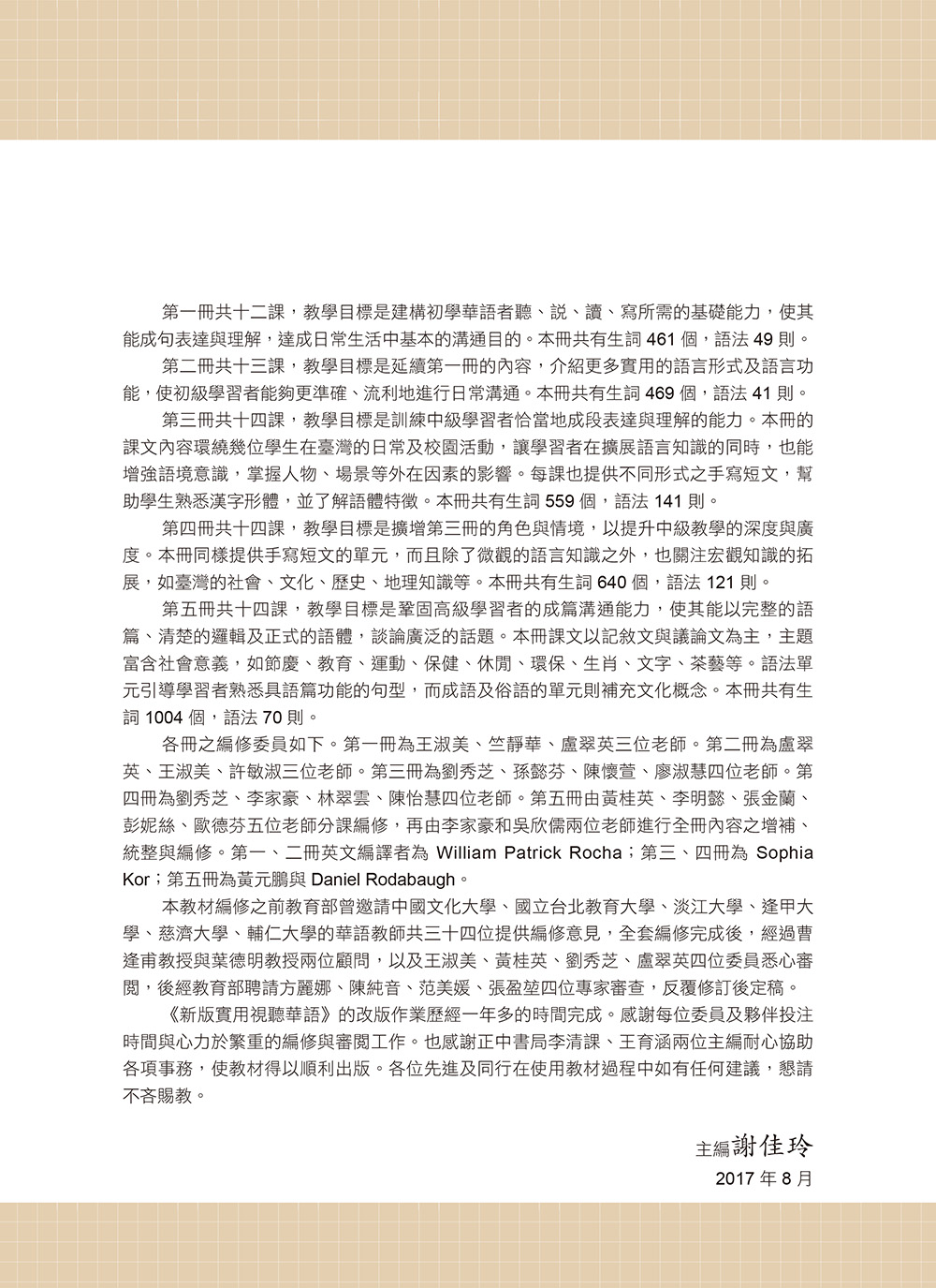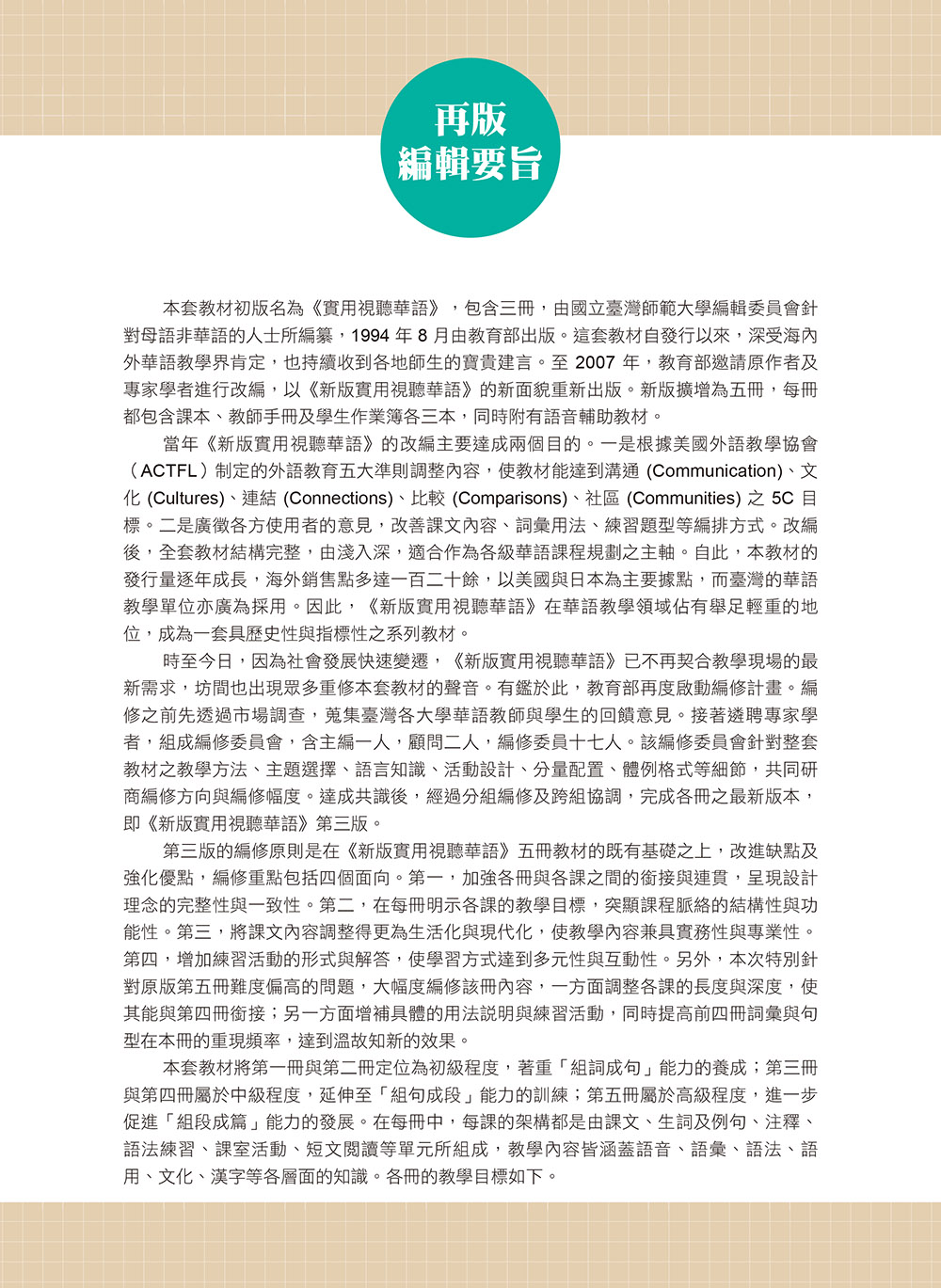 Due to the fast changing society, some contents of the “New Version Practical Audio-Visual Chinese” are not applicable to the updated needs in Chinese courses; therefore, the Ministry of Education of R.O.C. started the revision plan. The 3rd version is completed with the integration of the opinions from every aspect, the modification of out-of-date contents, the enhancement of the repetition rate of example sentences and characters, and the addition of brand new drawings and photos for efficient learning.